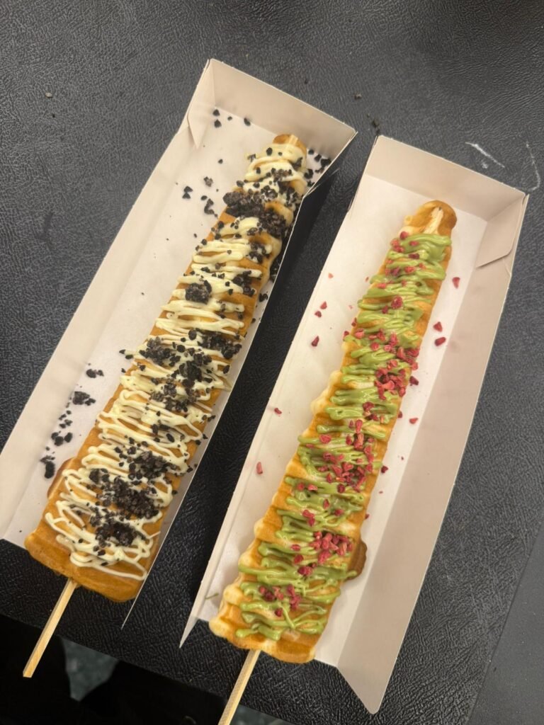 Crispy golden waffles served on a stick, dipped or drizzled with your favorite flavors for easy enjoyment.