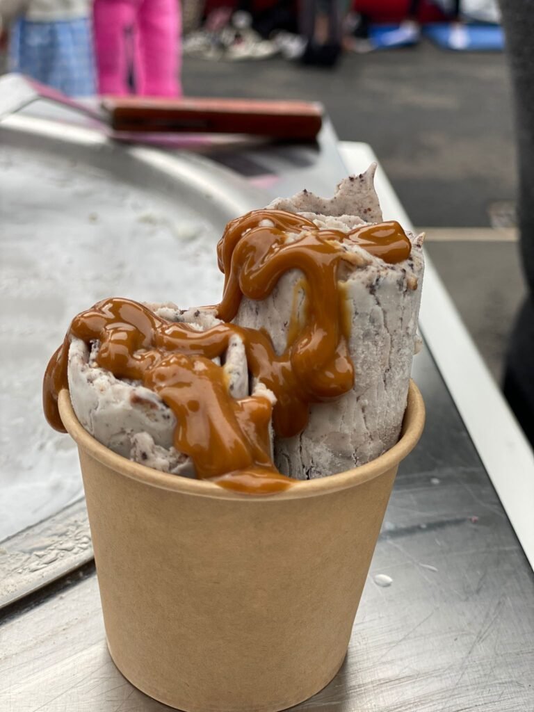 Freshly made ice cream spread, rolled, and served in beautiful spirals right before your eyes.